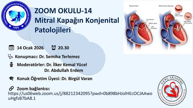 ZOOM OKULU 14- “Mitral Kapağın Konjenital Patolojileri” 14 Ocak 2026 Çarşamba günü saat 20.30’da online yapılacaktır.