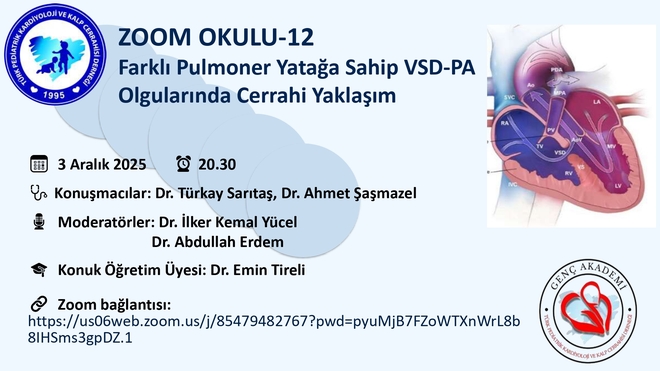ZOOM OKULU- 12: “Farklı Pulmoner Yatağa Sahip VSD-PA Olgularında Cerrahi Yaklaşım” 3 Aralık 2025 saat 20.30’da online yapılacaktır.