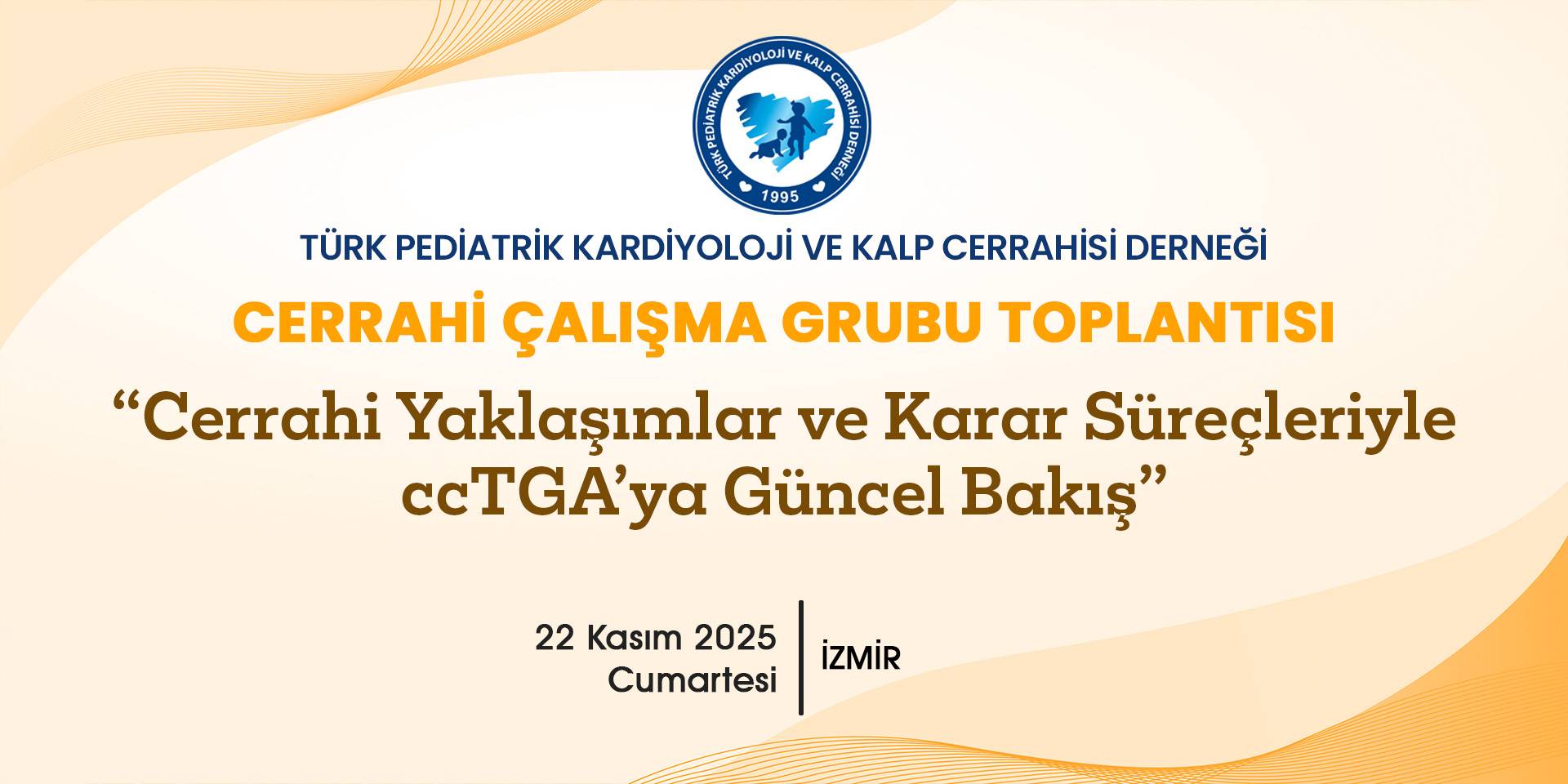 CERRAHİ ÇALIŞMA GRUBU TOPLANTISI- “Cerrahi Yaklaşımlar ve Karar Süreçleriyle Konjenital Düzeltilmiş Büyük Arter Transpozisyonu (ccTGA)ya Güncel Bakış” 22 Kasım 2025 tarihinde İzmir’de gerçekleştirilecektir.